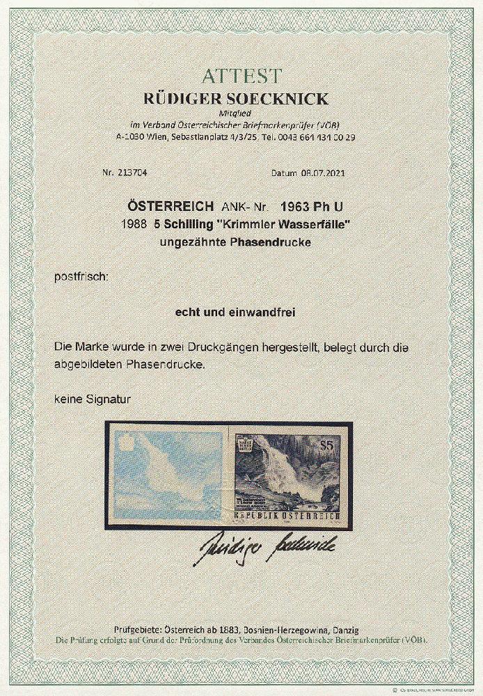 | Zusatzinformationen und Suchstichworte: | 11. Auktion Stilus Auktionstermin: 5. Juni 2022 Los 263 Österreich 2. Republik Österreich, 1988, ANK-Nr.: 1963 Ph U (Michel-Nr.: 1932), 'Naturschönheiten in Österreich', 5 Schilling, ungezähnte Phasendrucke (2), postfrisch **, einwandfreie Erhaltung, Attest Soecknick VÖB Ausruf 100,00 EUR |