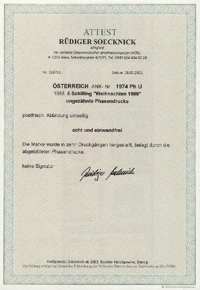 | Zusatzinformationen und Suchstichworte: | 11. Auktion Stilus Auktionstermin: 5. Juni 2022 Los 269 Österreich 2. Republik Österreich, 1988, ANK-Nr.: 1974 Ph U (Michel-Nr.: 1943), 'Weihnachten 1988', 5 Schilling, ungezähnte Phasendrucke (10), postfrisch **, einwandfreie Erhaltung, Attest Soecknick VÖB Zuschlag 100,00 EUR |