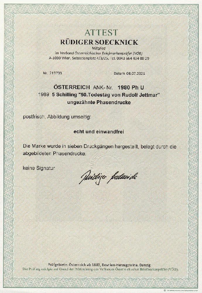 | Zusatzinformationen und Suchstichworte: | 11. Auktion Stilus Auktionstermin: 5. Juni 2022 Los 273 Österreich 2. Republik Österreich, 1989, ANK-Nr.: 1980 Ph U (Michel-Nr.: 1948), '50. Todestag von Rudolf Jettmar', 5 Schilling, ungezähnte Phasendrucke (7), postfrisch **, einwandfreie Erhaltung, Attest Soecknick VÖB Zuschlag 100,00 EUR |