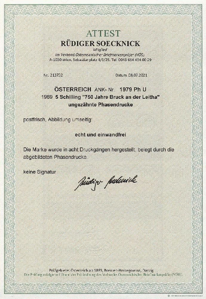 | Zusatzinformationen und Suchstichworte: | 11. Auktion Stilus Auktionstermin: 5. Juni 2022 Los 274 Österreich 2. Republik Österreich, 1989, ANK-Nr.: 1979 Ph U (Michel-Nr.: 1949), '750 Jahre Stadt Bruck an der Leitha', 5 Schilling, ungezähnte Phasendrucke (8), postfrisch **, einwandfreie Erhaltung, Attest Soecknick VÖB Ausruf 100,00 EUR |