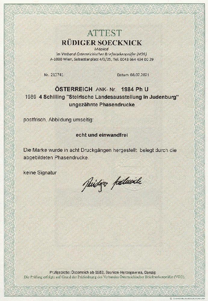 | Zusatzinformationen und Suchstichworte: | 11. Auktion Stilus Auktionstermin: 5. Juni 2022 Los 277 Österreich 2. Republik Österreich, 1989, ANK-Nr.: 1984 Ph U (Michel-Nr.: 1953), 'Steirische Landesausstellung. Menschen - Münzen - Märkte - Judenburg', 4 Schilling, ungezähnte Phasendrucke (8), postfrisch **, einwandfreie Erhaltung, Attest Soecknick VÖB Ausruf 100,00 EUR |