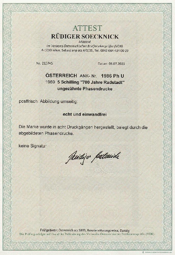 | Zusatzinformationen und Suchstichworte: | 11. Auktion Stilus Auktionstermin: 5. Juni 2022 Los 279 Österreich 2. Republik Österreich, 1989, ANK-Nr.: 1986 Ph U (Michel-Nr.: 1955), '700 Jahre Radstadt', 5 Schilling, ungezähnte Phasendrucke (8), postfrisch **, einwandfreie Erhaltung, Attest Soecknick VÖB Zuschlag 100,00 EUR |