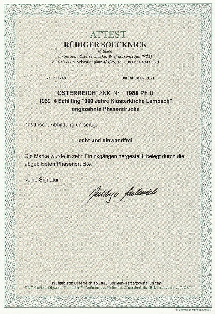 | Zusatzinformationen und Suchstichworte: | 11. Auktion Stilus Auktionstermin: 5. Juni 2022 Los 280 Österreich 2. Republik Österreich, 1989, ANK-Nr.: 1988 Ph U (Michel-Nr.: 1957), 'OÖ. Landesausstellung - 900 Jahre Klosterkirche Lambach', 4 Schilling, ungezähnte Phasendrucke (10), postfrisch **, einwandfreie Erhaltung, Attest Soecknick VÖB Zuschlag 100,00 EUR |