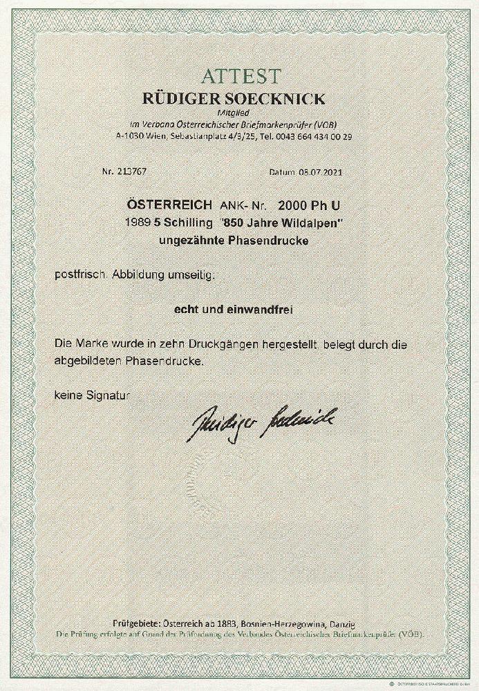 | Zusatzinformationen und Suchstichworte: | 11. Auktion Stilus Auktionstermin: 5. Juni 2022 Los 287 Österreich 2. Republik Österreich, 1989, ANK-Nr.: 2000 Ph U (Michel-Nr.: 1969), '850 Jahre Wildalpen', 5 Schilling, ungezähnte Phasendrucke (10), postfrisch **, einwandfreie Erhaltung, Attest Soecknick VÖB Ausruf 100,00 EUR |