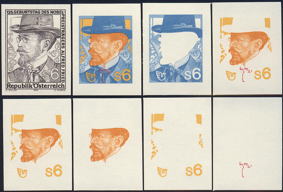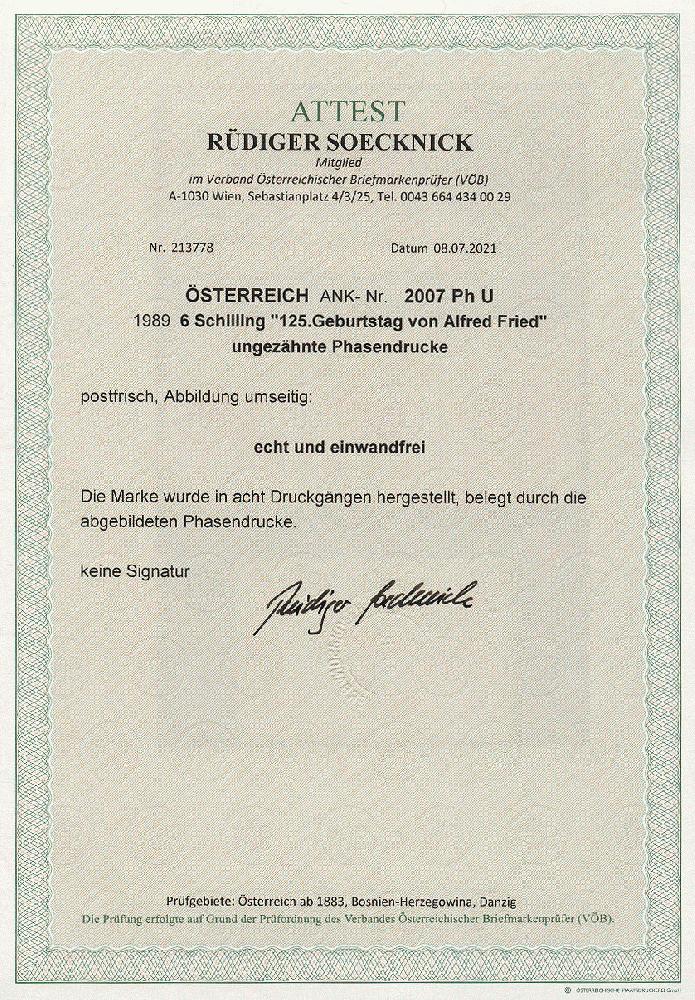 | Zusatzinformationen und Suchstichworte: | 11. Auktion Stilus Auktionstermin: 5. Juni 2022 Los 291 Österreich 2. Republik Österreich, 1989, ANK-Nr.: 2007 Ph U (Michel-Nr.: 1976), '125. Geb. von Alfred Fried', 6 Schilling, ungezähnte Phasendrucke (8), postfrisch **, einwandfreie Erhaltung, Attest Soecknick VÖB Ausruf 100,00 EUR |
