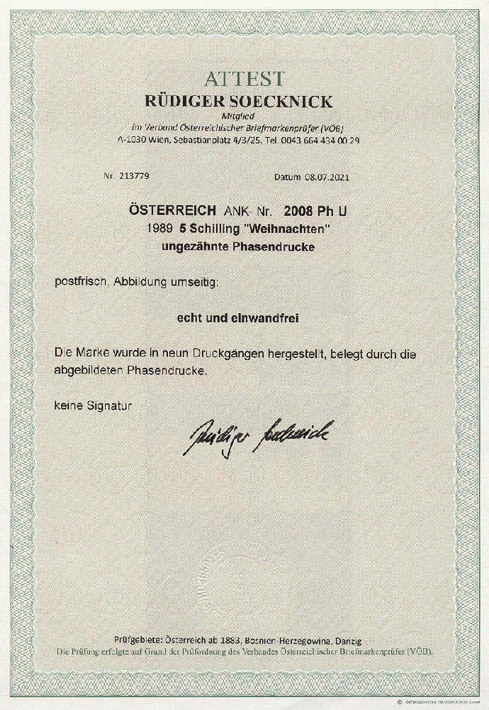 | Zusatzinformationen und Suchstichworte: | 11. Auktion Stilus Auktionstermin: 5. Juni 2022 Los 292 Österreich 2. Republik Österreich, 1989, ANK-Nr.: 2008 Ph U (Michel-Nr.: 1977), 'Weihnachten 1989', 5 Schilling, ungezähnte Phasendrucke (9), postfrisch **, einwandfreie Erhaltung, Attest Soecknick VÖB Zuschlag 100,00 EUR |