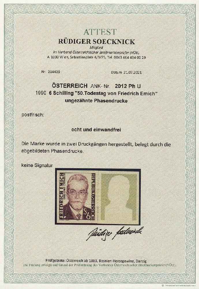 | Zusatzinformationen und Suchstichworte: | 11. Auktion Stilus Auktionstermin: 5. Juni 2022 Los 293 Österreich 2. Republik Österreich, 1990, ANK-Nr.: 2012 Ph U (Michel-Nr.: 1981), '50. Todestag von Friedrich Emich', 6 Schilling, ungezähnte Phasendrucke (2), postfrisch **, einwandfreie Erhaltung, Attest Soecknick VÖB Ausruf 100,00 EUR |