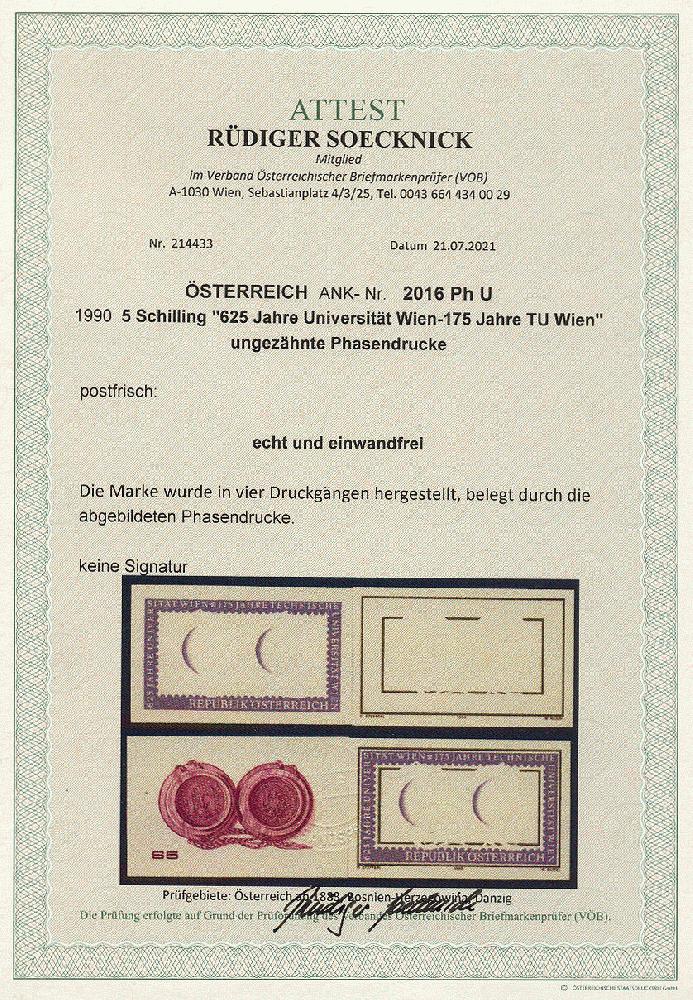| Zusatzinformationen und Suchstichworte: | 11. Auktion Stilus Auktionstermin: 5. Juni 2022 Los 295 Österreich 2. Republik Österreich, 1990, ANK-Nr.: 2016 Ph U (Michel-Nr.: 1984), '625 Jahre Universität Wien - 175 Jahre Technische Universität Wien', 5 Schilling, ungezähnte Phasendrucke (4), postfrisch **, einwandfreie Erhaltung, Attest Soecknick VÖB Ausruf 100,00 EUR |