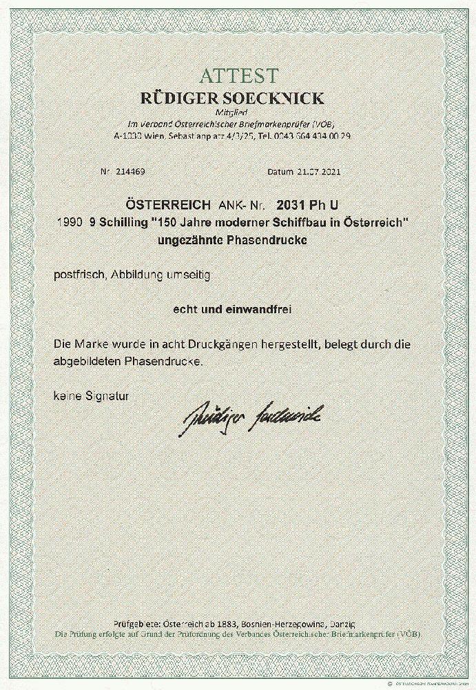 | Zusatzinformationen und Suchstichworte: | 11. Auktion Stilus Auktionstermin: 5. Juni 2022 Los 301 Österreich 2. Republik Österreich, 1990, ANK-Nr.: 2031 Ph U (Michel-Nr.: 1999), '150 Jahre moderner Schiffbau in Österreich', 9 Schilling, ungezähnte Phasendrucke (8), postfrisch **, einwandfreie Erhaltung, Attest Soecknick VÖB Zuschlag 100,00 EUR |