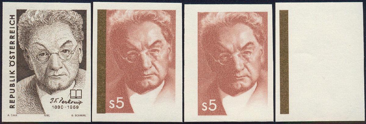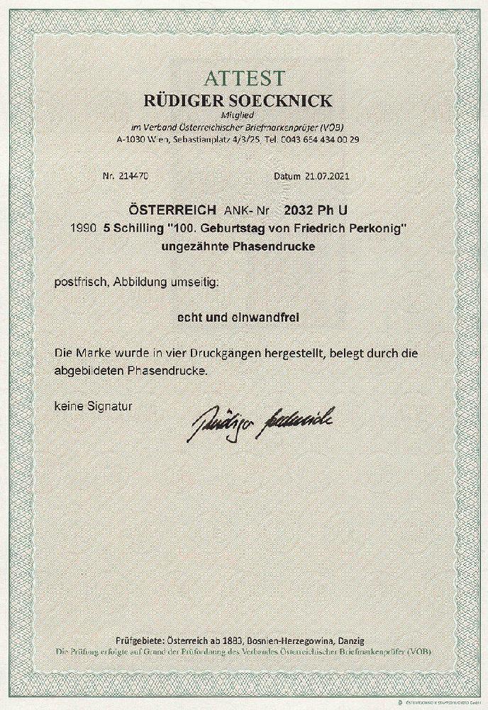 | Zusatzinformationen und Suchstichworte: | 11. Auktion Stilus Auktionstermin: 5. Juni 2022 Los 302 Österreich 2. Republik Österreich, 1990, ANK-Nr.: 2032 Ph U (Michel-Nr.: 2000), '100. Geb. von Friedrich Perkonig', 5 Schilling, ungezähnte Phasendrucke (4), postfrisch **, einwandfreie Erhaltung, Attest Soecknick VÖB Ausruf 100,00 EUR |