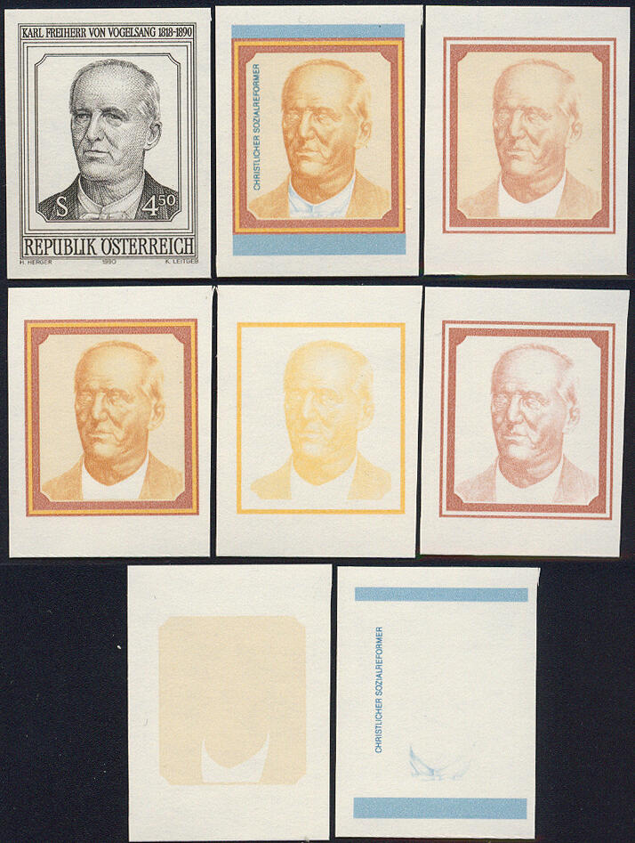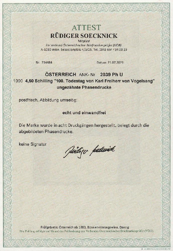 | Zusatzinformationen und Suchstichworte: | 11. Auktion Stilus Auktionstermin: 5. Juni 2022 Los 306 Österreich 2. Republik Österreich, 1990, ANK-Nr.: 2039 Ph U (Michel-Nr.: 2008), '100. Todestag von Karl Freiherr von Vogelsang', 4,5 Schilling, ungezähnte Phasendrucke (8), postfrisch **, einwandfreie Erhaltung, Attest Soecknick VÖB Ausruf 100,00 EUR |