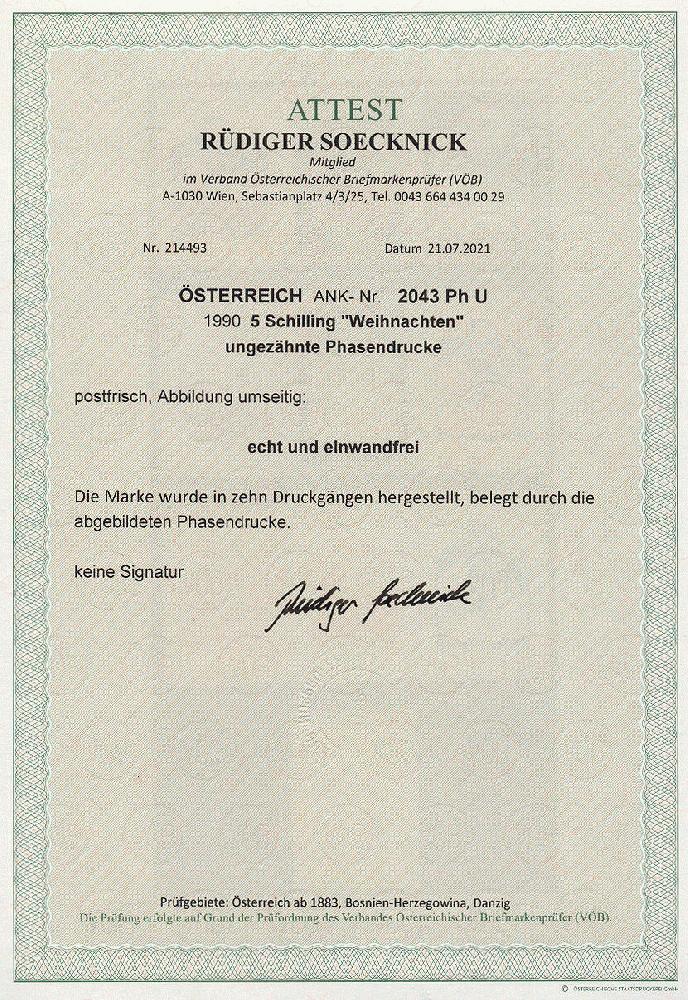 | Zusatzinformationen und Suchstichworte: | 11. Auktion Stilus Auktionstermin: 5. Juni 2022 Los 308 Österreich 2. Republik Österreich, 1990, ANK-Nr.: 2043 Ph U (Michel-Nr.: 2012), 'Weihnachten 1990', 5 Schilling, ungezähnte Phasendrucke (10), postfrisch **, einwandfreie Erhaltung, Attest Soecknick VÖB Zuschlag 110,00 EUR |
