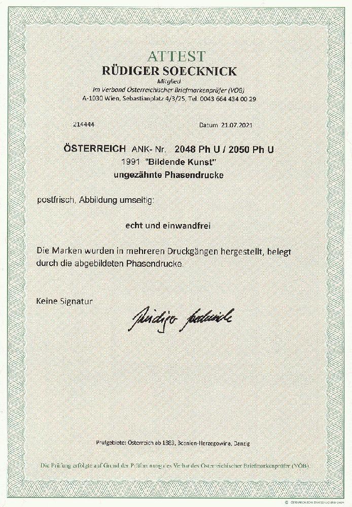 | Zusatzinformationen und Suchstichworte: | 11. Auktion Stilus Auktionstermin: 5. Juni 2022 Los 310 Österreich 2. Republik Österreich, 1991, ANK-Nr.: 2048 - 2050 Ph U (Michel-Nr.: 2017 - 2019), 'Bildende Kunst', 4,5 - 7 Schilling, ungezähnte Phasendrucke (34), postfrisch **, einwandfreie Erhaltung, Attest Soecknick VÖB Zuschlag 300,00 EUR |