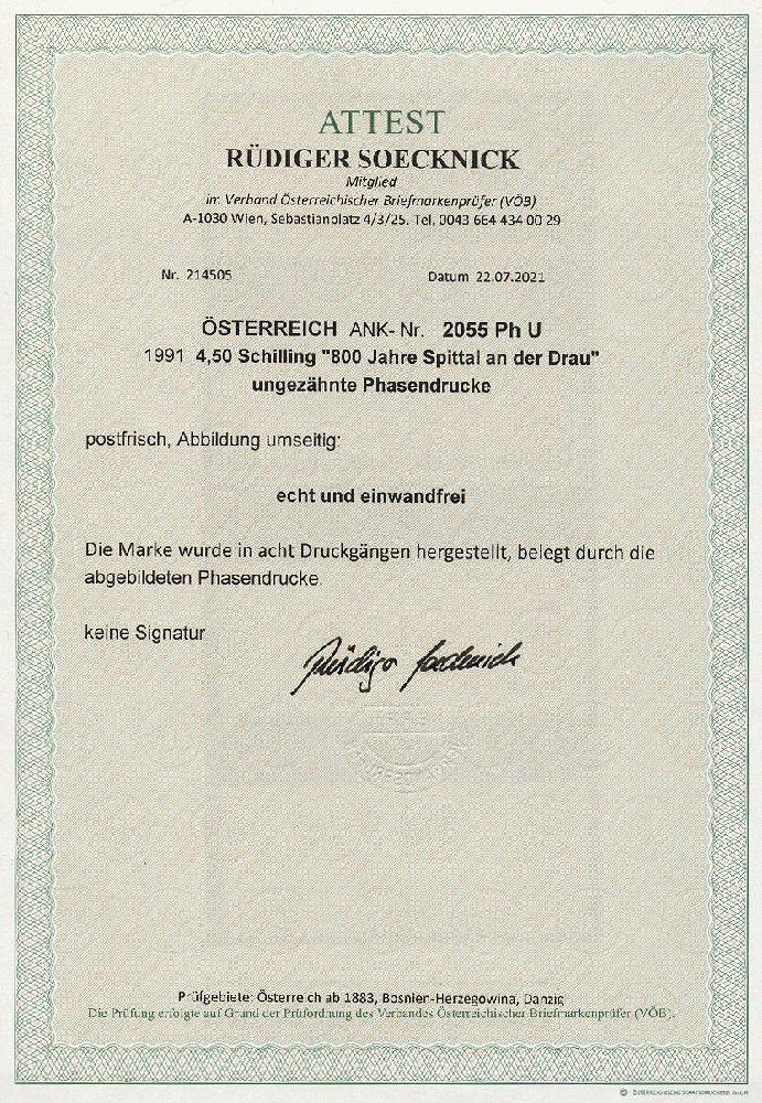 | Zusatzinformationen und Suchstichworte: | 11. Auktion Stilus Auktionstermin: 5. Juni 2022 Los 312 Österreich 2. Republik Österreich, 1991, ANK-Nr.: 2055 Ph U (Michel-Nr.: 2024), '800 Jahre Spittal/Drau', 4,5 Schilling, ungezähnte Phasendrucke (8), postfrisch **, einwandfreie Erhaltung, Attest Soecknick VÖB Ausruf 100,00 EUR |