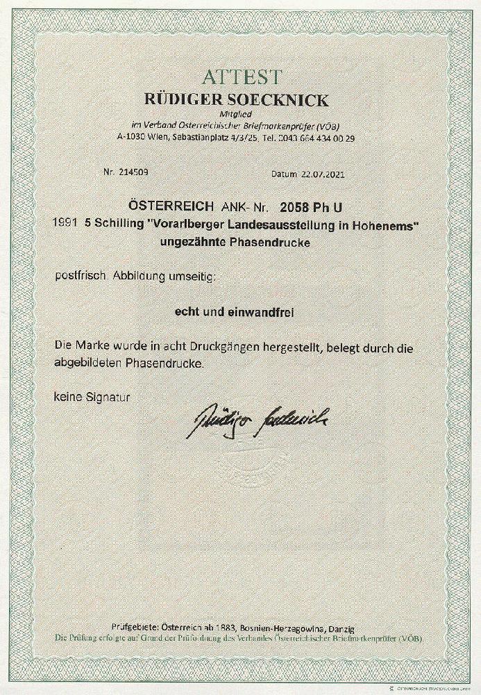 | Zusatzinformationen und Suchstichworte: | 11. Auktion Stilus Auktionstermin: 5. Juni 2022 Los 313 Österreich 2. Republik Österreich, 1991, ANK-Nr.: 2058 Ph U (Michel-Nr.: 2027), 'Vorarlberger Landesausstellung in Hohenems', 5 Schilling, ungezähnte Phasendrucke (8), postfrisch **, einwandfreie Erhaltung, Attest Soecknick VÖB Ausruf 100,00 EUR |