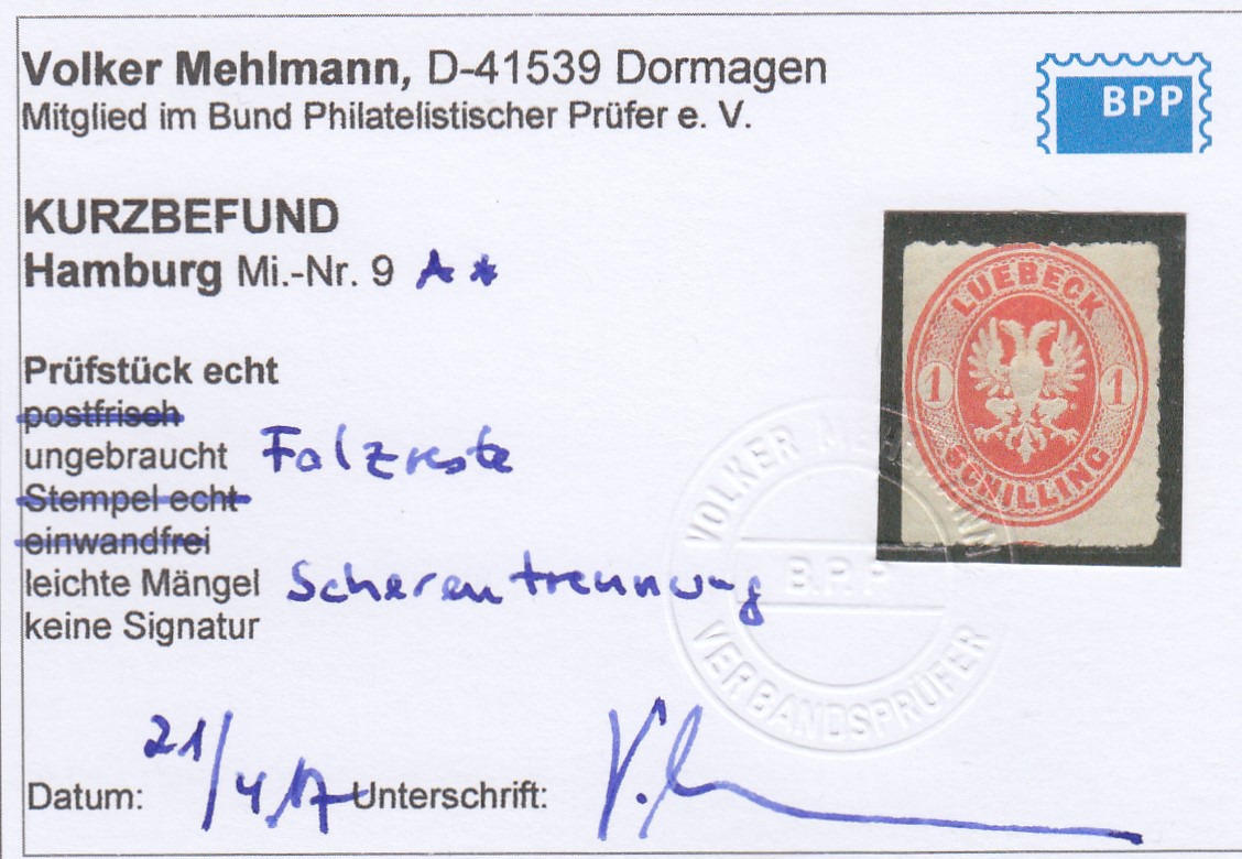 | Zusatzinformationen und Suchstichworte: | Falschattest: irrtümlich auf Hamburg Nr. 9 anstelle Lübeck Nr. 9 ausgestellt |