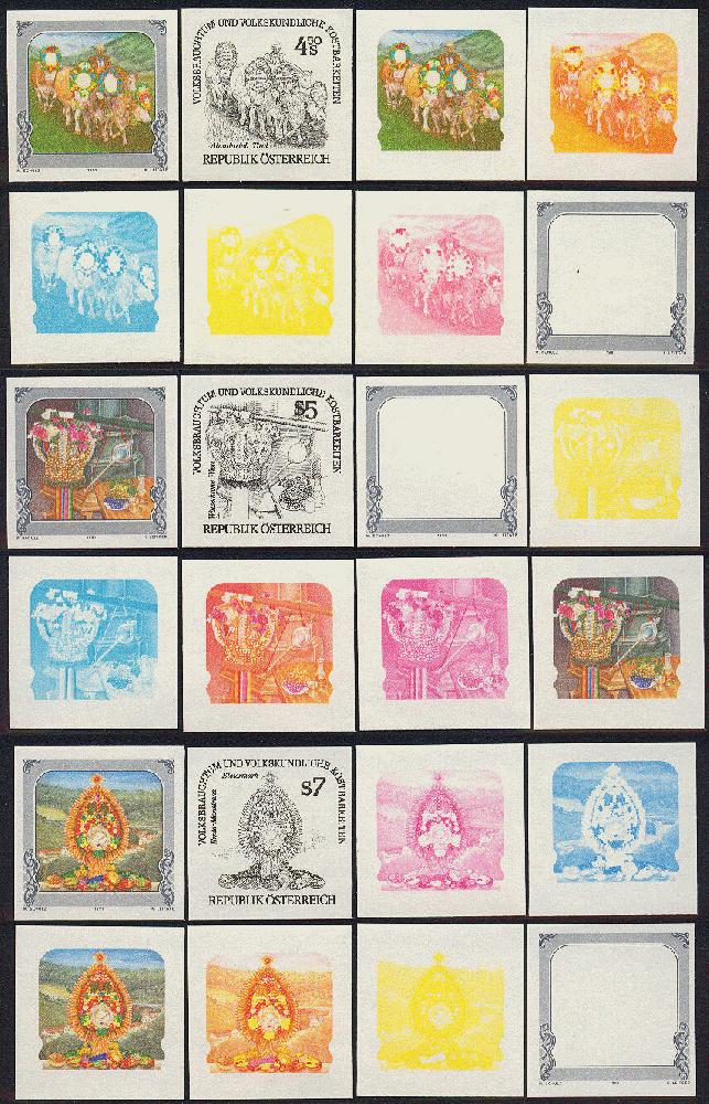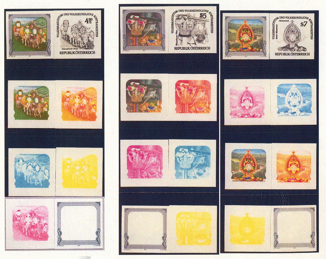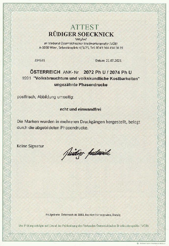 | Zusatzinformationen und Suchstichworte: | 11. Auktion Stilus Auktionstermin: 5. Juni 2022 Los 321 Österreich 2. Republik Österreich, 1991, ANK-Nr.: 2072 - 2074 Ph U (Michel-Nr.: 2041 - 2043), 'Volksbrauchtum und volkskundliche Kostbarkeiten', 4,5 - 7 Schilling, ungezähnte Phasendrucke (24), postfrisch **, einwandfreie Erhaltung, Attest Soecknick VÖB Ausruf 300,00 EUR |