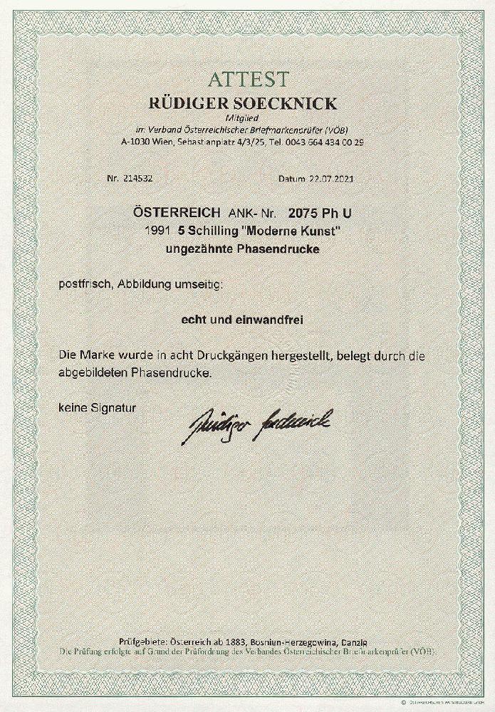 | Zusatzinformationen und Suchstichworte: | 11. Auktion Stilus Auktionstermin: 5. Juni 2022 Los 323 Österreich 2. Republik Österreich, 1991, ANK-Nr.: 2075 Ph U (Michel-Nr.: 2045), 'Moderne Kunst in Österreich', 5 Schilling, ungezähnte Phasendrucke (8), postfrisch **, einwandfreie Erhaltung, Attest Soecknick VÖB Zuschlag 100,00 EUR |