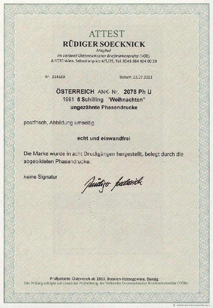 | Zusatzinformationen und Suchstichworte: | 11. Auktion Stilus Auktionstermin: 5. Juni 2022 Los 324 Österreich 2. Republik Österreich, 1991, ANK-Nr.: 2078 Ph U (Michel-Nr.: 2046), 'Weihnachten 1991', 5 Schilling, ungezähnte Phasendrucke (8), postfrisch **, einwandfreie Erhaltung, Attest Soecknick VÖB Ausruf 100,00 EUR |