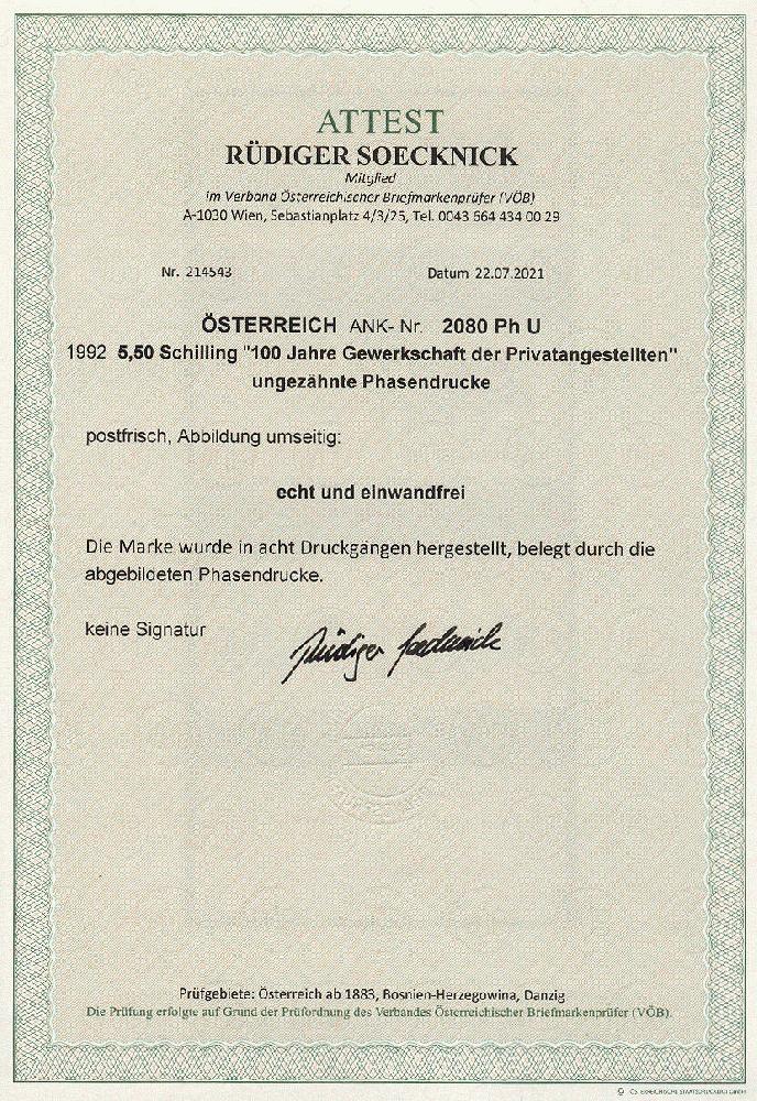 | Zusatzinformationen und Suchstichworte: | 11. Auktion Stilus Auktionstermin: 5. Juni 2022 Los 326 Österreich 2. Republik Österreich, 1992, ANK-Nr.: 2080 Ph U (Michel-Nr.: 2049), '100 Jahre Gewerkschaft der Privatangestellten', 5,5 Schilling, ungezähnte Phasendrucke (8), postfrisch **, einwandfreie Erhaltung, Attest Soecknick VÖB Ausruf 100,00 EUR |