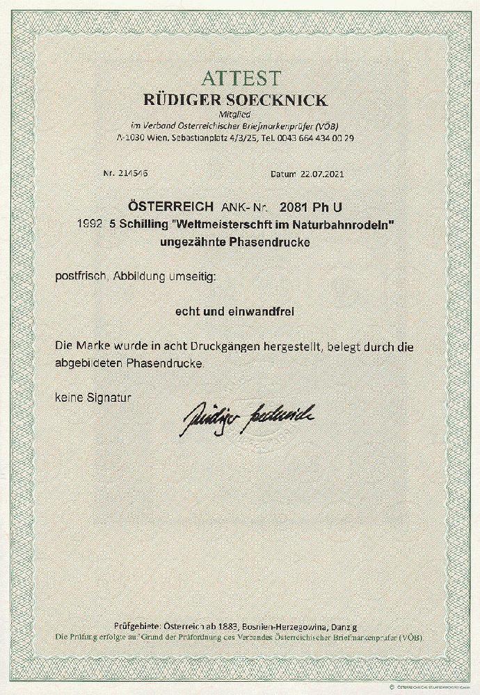 | Zusatzinformationen und Suchstichworte: | 11. Auktion Stilus Auktionstermin: 5. Juni 2022 Los 327 Österreich 2. Republik Österreich, 1992, ANK-Nr.: 2081 Ph U (Michel-Nr.: 2050), '8. Weltmeisterschaft im Rodeln auf Naturbahn', 5 Schilling, ungezähnte Phasendrucke (8), postfrisch **, einwandfreie Erhaltung, Attest Soecknick VÖB Zuschlag 100,00 EUR |