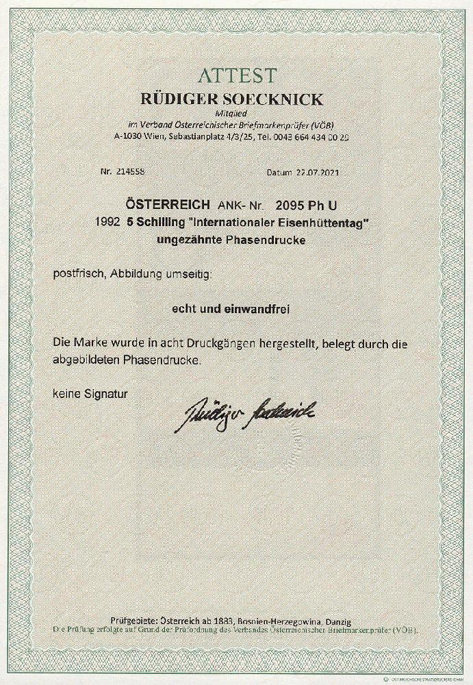 | Zusatzinformationen und Suchstichworte: | 11. Auktion Stilus Auktionstermin: 5. Juni 2022 Los 333 Österreich 2. Republik Österreich, 1992, ANK-Nr.: 2095 Ph U (Michel-Nr.: 2063), 'Int. Eisenhüttentag', 5 Schilling, ungezähnte Phasendrucke (8), postfrisch **, einwandfreie Erhaltung, Attest Soecknick VÖB Ausruf 100,00 EUR |