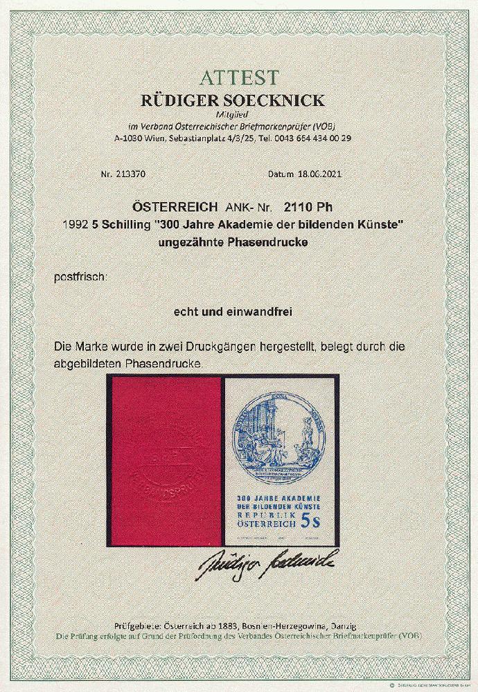 | Zusatzinformationen und Suchstichworte: | 11. Auktion Stilus Auktionstermin: 5. Juni 2022 Los 338 Österreich 2. Republik Österreich, 1992, ANK-Nr.: 2110 Ph U (Michel-Nr.: 2079), '300 Jahre Akademie der bildenden Künste', 5 Schilling, ungezähnte Phasendrucke (2), postfrisch **, einwandfreie Erhaltung, Attest Soecknick VÖB Ausruf 100,00 EUR |