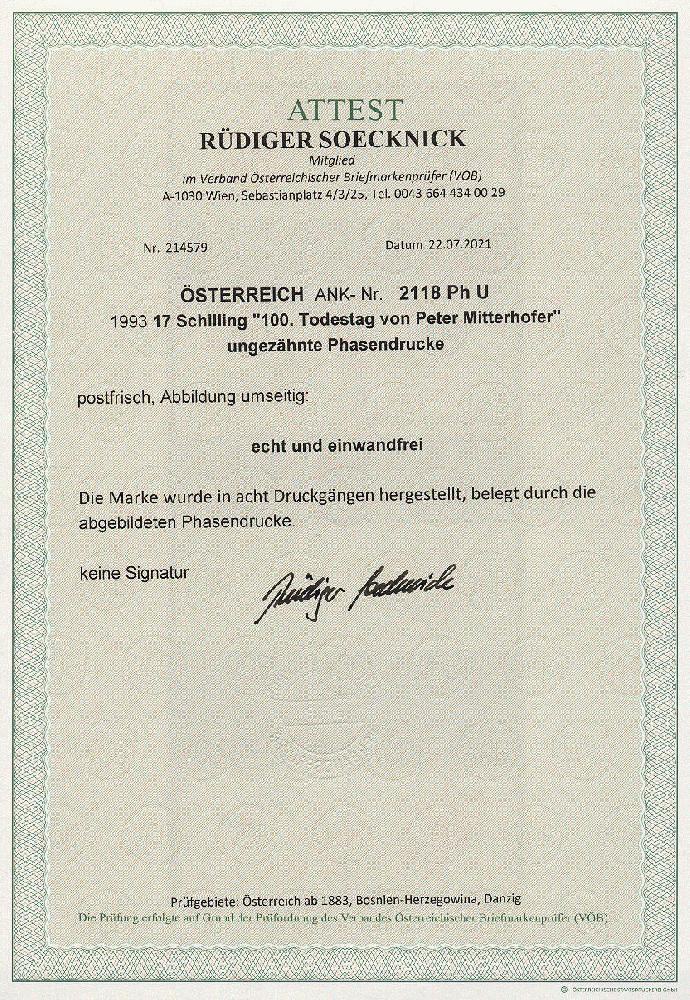 | Zusatzinformationen und Suchstichworte: | 11. Auktion Stilus Auktionstermin: 5. Juni 2022 Los 342 Österreich 2. Republik Österreich, 1993, ANK-Nr.: 2118 Ph U (Michel-Nr.: 2088), '100. Todestag von Peter Mitterhofer', 17 Schilling, ungezähnte Phasendrucke (8), postfrisch **, einwandfreie Erhaltung, Attest Soecknick VÖB Ausruf 100,00 EUR |