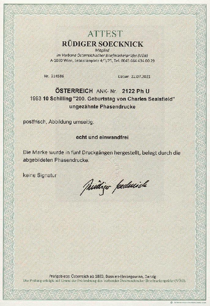 | Zusatzinformationen und Suchstichworte: | 11. Auktion Stilus Auktionstermin: 5. Juni 2022 Los 344 Österreich 2. Republik Österreich, 1993, ANK-Nr.: 2122 Ph U (Michel-Nr.: 2090), '200. Geb. von Charles Sealsfield', 10 Schilling, ungezähnte Phasendrucke (5), postfrisch **, einwandfreie Erhaltung, Attest Soecknick VÖB Ausruf 100,00 EUR |