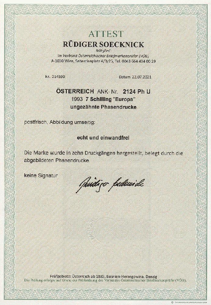 | Zusatzinformationen und Suchstichworte: | 11. Auktion Stilus Auktionstermin: 5. Juni 2022 Los 347 Österreich 2. Republik Österreich, 1993, ANK-Nr.: 2124 Ph U (Michel-Nr.: 2095), 'Europa 1993', 7 Schilling, ungezähnte Phasendrucke (10), postfrisch **, einwandfreie Erhaltung, Attest Soecknick VÖB Zuschlag 100,00 EUR |