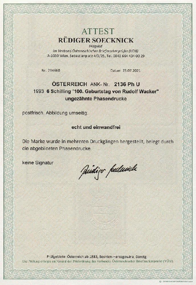 | Zusatzinformationen und Suchstichworte: | 11. Auktion Stilus Auktionstermin: 5. Juni 2022 Los 352 Österreich 2. Republik Österreich, 1993, ANK-Nr.: 2136 Ph U (Michel-Nr.: 2103), '100. Geb. des Malers Rudolf Wacker', 6 Schilling, ungezähnte Phasendrucke (11), postfrisch **, eine Marke eng geschnitten sonst einwandfreie Erhaltung, Attest Soecknick VÖB Zuschlag 100,00 EUR |
