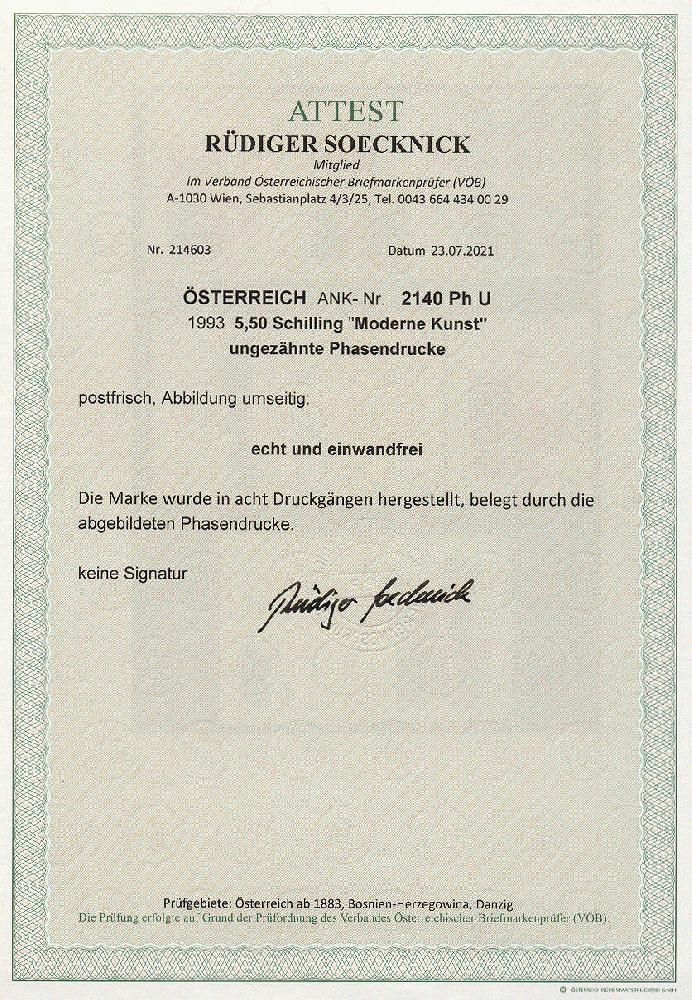 | Zusatzinformationen und Suchstichworte: | 11. Auktion Stilus Auktionstermin: 5. Juni 2022 Los 355 Österreich 2. Republik Österreich, 1993, ANK-Nr.: 2140 Ph U (Michel-Nr.: 2110), 'Moderne Kunst in Österreich', 5,5 Schilling, ungezähnte Phasendrucke (8), postfrisch **, einwandfreie Erhaltung, Attest Soecknick VÖB Zuschlag 100,00 EUR |