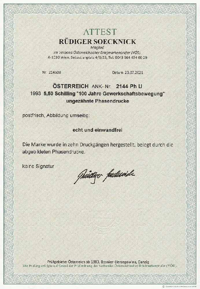 | Zusatzinformationen und Suchstichworte: | 11. Auktion Stilus Auktionstermin: 5. Juni 2022 Los 356 Österreich 2. Republik Österreich, 1993, ANK-Nr.: 2144 Ph U (Michel-Nr.: 2112), '100 Jahre Gewerkschaftsbewegung', 5,5 Schilling, ungezähnte Phasendrucke (10), postfrisch **, einwandfreie Erhaltung, Attest Soecknick VÖB Ausruf 100,00 EUR |