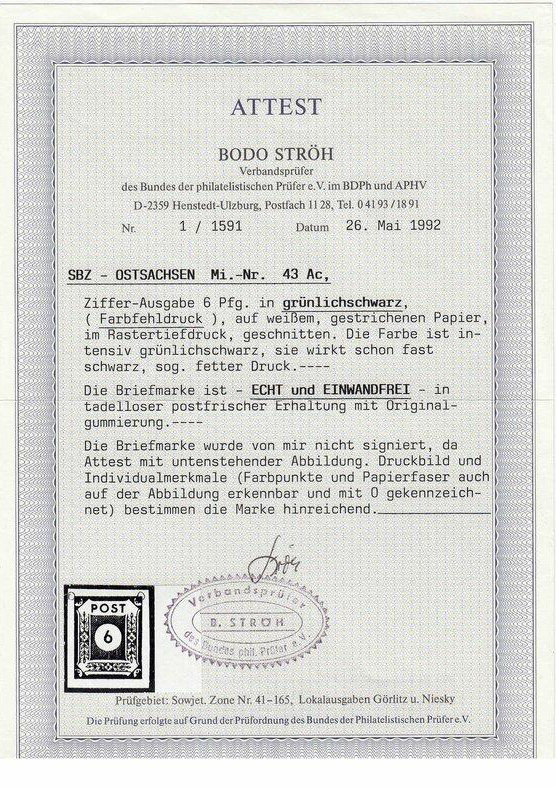 | Zusatzinformationen und Suchstichworte: | Büteröwe Webshop Los 40552 SBZ allgemeine Ausgabe SBZ 1945 Mi.-Nr.: 43 Ac ** geprüft Attest 6 Pf. Ziffern 1945, bessere Farbe ,,grünschwarz", postfrische Erhaltung, unsigniert. Fotoattest Ströh BPP >ECHT UND EINWANDFREI Festpreis 499,95 EUR |