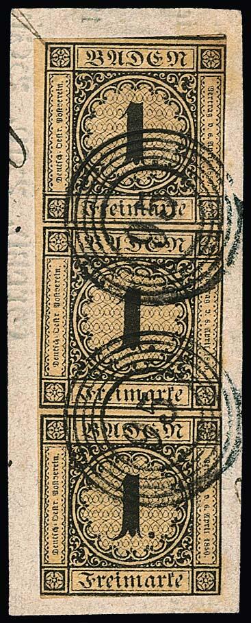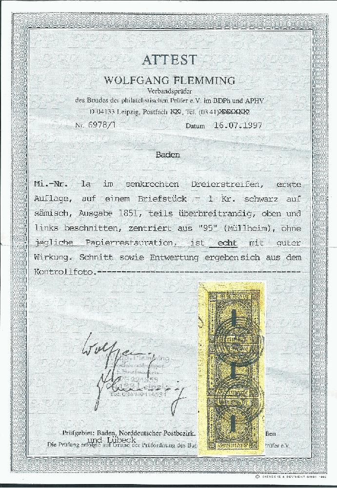 | Zusatzinformationen und Suchstichworte: | Rauhut & Kruschel - 212. Auktion Auktionstermin: 30. Juli 2022 Los 43 Altdeutschland Baden 1 Kr. schw./sämisch im Dreierstreifen vom linken Bogenrand auf Prachtbriefstück mit klaren NS "95" (Müllheim), ausgabetypisch geschnitten, d.h., rechts und untere Marke etwas berührt, sonst voll- bis breitrandig, Attest Flemming. Mi. 3600,- Ausruf 650,00 EUR |
