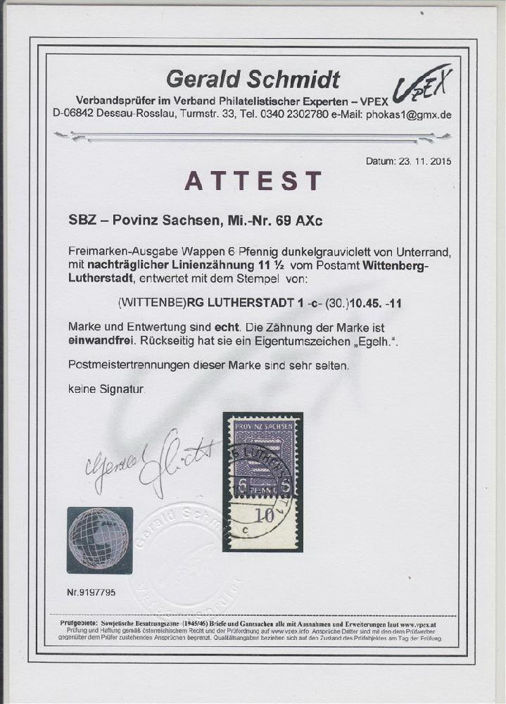 | Zusatzinformationen und Suchstichworte: | SBZ Provinz Sachsen Michel-Nr. 69 A X c Wittenberg gest. Attest Schmidt VPEX Thilo Nagler, Hofbachstraße 58, 57078 Siegen |