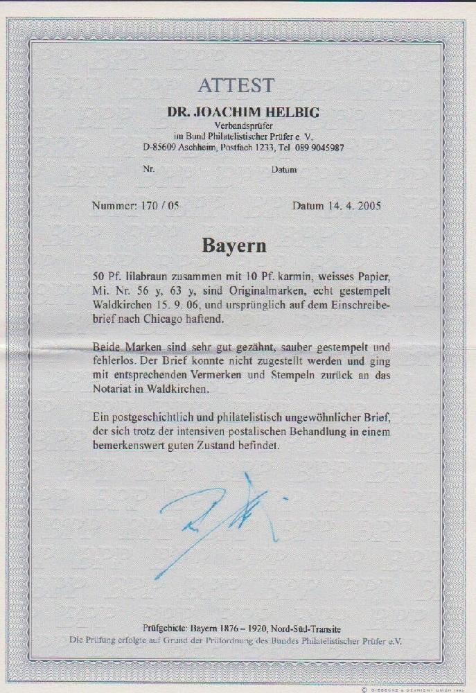 | Zusatzinformationen und Suchstichworte: | Rauhut & Kruschel - 212. Auktion Auktionstermin: 30. Juli 2022 Los 359 Altdeutschland Bayern 10 Pfg. rot und 50 Pfg. braunpurpur vorderseitig auf R-Brief von Waldkirchen 1906 nach Chicago/USA und von dort mit zahlreichen Vermerken retour. Attest Helbig Ausruf 130,00 EUR |