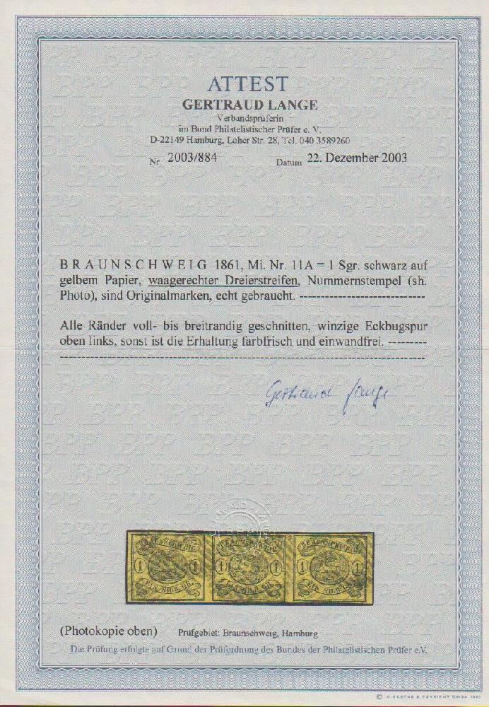 | Zusatzinformationen und Suchstichworte: | Rauhut & Kruschel - 212. Auktion Auktionstermin: 30. Juli 2022 Los 571 Altdeutschland Braunschweig 1 Sgr. schw./gelb, seltener gestempelter Dreierstreifen (linke Marke winziger Eckbug), Attest Lange. Mi. 1500,- Ausruf 220,00 EUR |