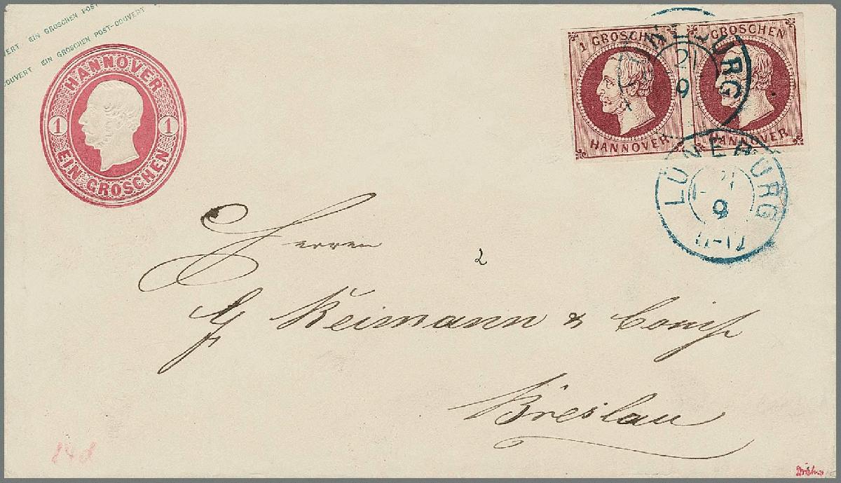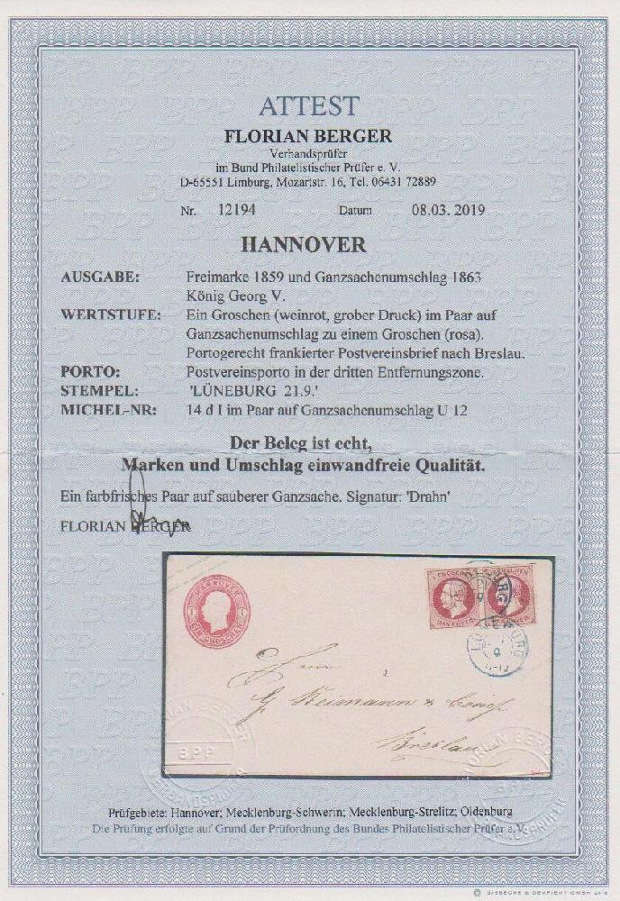 | Zusatzinformationen und Suchstichworte: | Rauhut & Kruschel - 212. Auktion Auktionstermin: 30. Juli 2022 Los 785 Altdeutschland Hannover 1 Gr. weinrot, grober Druck, im Paar auf Ganzsache 1 Gr. rosa, mit K2 "Lüneburg" als Postvereinsbrief nach Breslau. Tadellose, ursprüngliche Erhaltung, sign. Drahn und Attest Berger "einwandfrei". Mi. 600,- Ausruf 250,00 EUR |