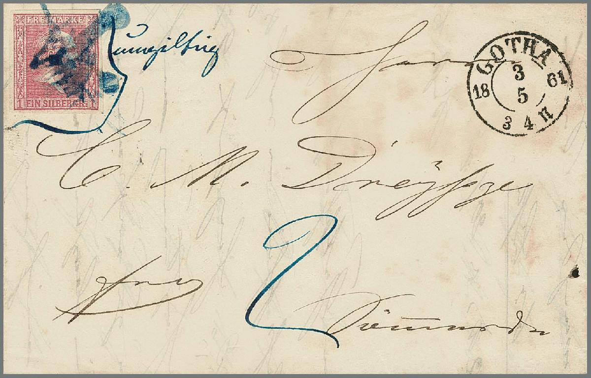 | Zusatzinformationen und Suchstichworte: | Rauhut & Kruschel - 212. Auktion Auktionstermin: 30. Juli 2022 Los 1140 Altdeutschland Preussen 1 Sgr. karmin, einwandfreies Exemplar auf Faltbrief (dieser rechts oben etwas fleckig) im Taxisgebiet verwendet mit Aufgabe-K2 "Gotha" 1861, Marke nicht anerkannt, hs. "ungültig" und mit "2" Sgr. Nachtaxe nach Sömmerda gelaufen. Attest Sem Ausruf 350,00 EUR |