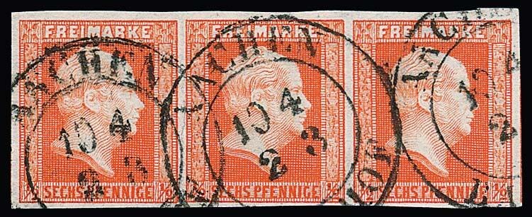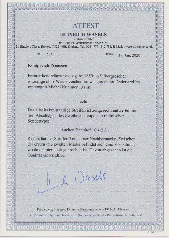| Zusatzinformationen und Suchstichworte: | Rauhut & Kruschel - 212. Auktion Auktionstermin: 30. Juli 2022 Los 1176 Altdeutschland Preussen 1/2 Sgr. ziegelrot, gut gerandeter Dreierstreifen mit besserem K2 "Aachen Bahnhof" in großer Rheinischer Sondertype. Die Marken einwandfrei (rechts Nebenmarke), lediglich im Zwischenraum zwischen 1. und 2. Marke kleiner Papierbruch. Attest Wasels. Mi. 800,- Ausruf 250,00 EUR |