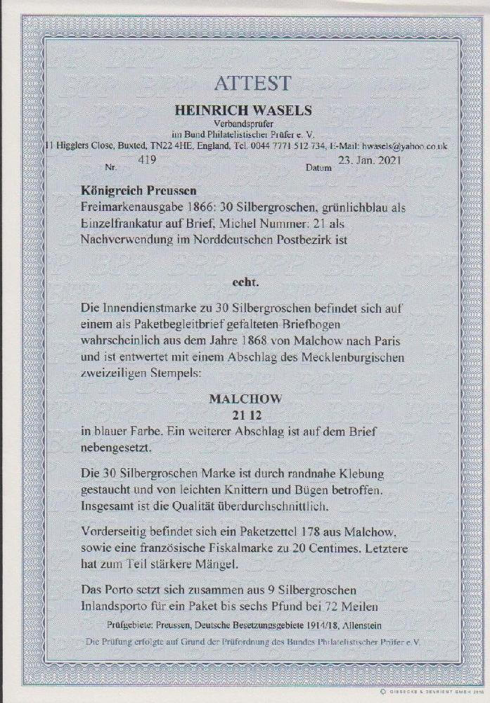 | Zusatzinformationen und Suchstichworte: | Rauhut & Kruschel - 212. Auktion Auktionstermin: 30. Juli 2022 Los 1212 Altdeutschland Preussen 30 Sgr. blau als Einzelfrankatur zur NDP-Zeit auf Paketbegleitbrief (typischer Dreiviertelbogen) mit blauem nachverwendetem Mecklenburger L2 "Malchow" nach Paris, dort vs. französ. Stempelmarke nachfrankiert. Völlig ursprüngliche Gebrauchserhaltung, die 30 Sgr. kleine Stauchung durch Randklebung und übliche Knitter/kleine Büge, aber voller Durchstich ohne Scherentrennung. Einzelfrankaturen dieser Marke sind sowohl aus der Preußen- als auch NDP-Zeit große Raritäten, etwa eine handvoll registriert. Attest Wasels "Insgesamt ist die Qualität überdurchschnittlich." Ausruf 2.500,00 EUR |