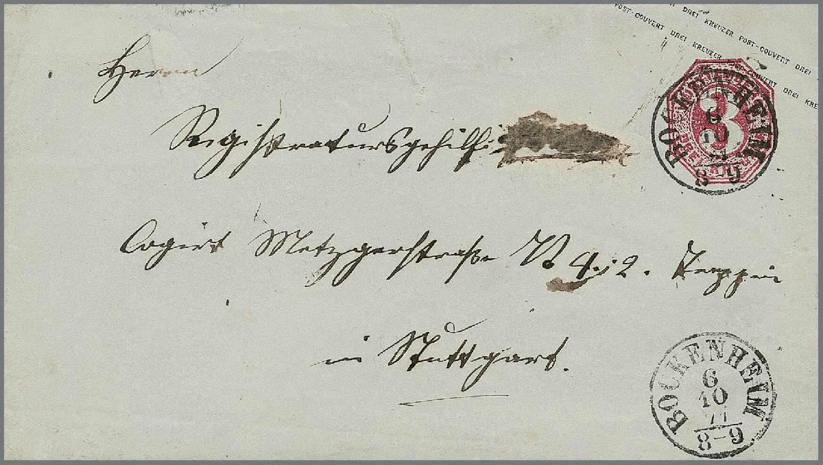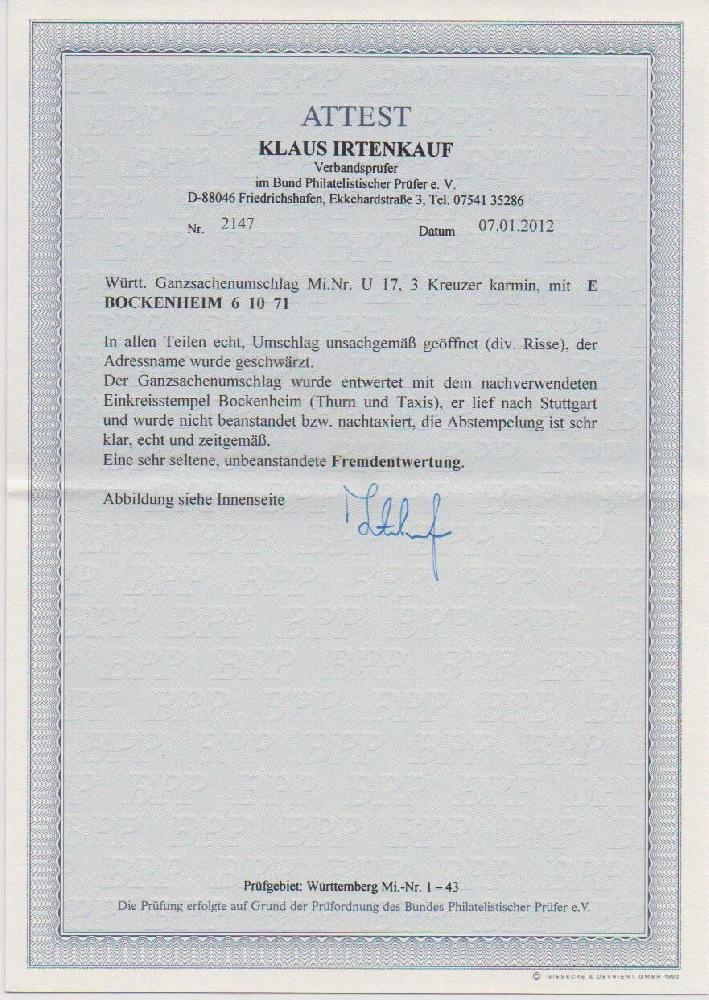 | Zusatzinformationen und Suchstichworte: | Rauhut & Kruschel - 212. Auktion Auktionstermin: 30. Juli 2022 Los 1540 Altdeutschland Thurn und Taxis "Bockenheim", K1 als völlig unbeanstandete Fremdentwertung auf Württemberger Ganzsache 3 Kr. rosa (Adressname geschwärzt und radiert), 1870 nach Stuttgart, Attest Irtenkauf Ausruf 350,00 EUR |