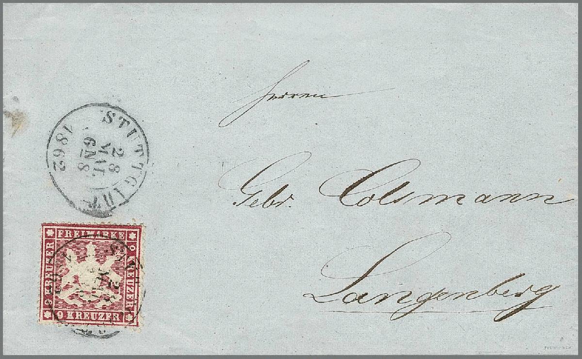 | Zusatzinformationen und Suchstichworte: | Rauhut & Kruschel - 212. Auktion Auktionstermin: 30. Juli 2022 Los 2235 Altdeutschland Württemberg 9 Kr. karmin, normal gezähnt, sowie lilarot, überdurchschnittlich gut gezähnt, zwei Prachtbriefe aus Stuttgart, sign. Pfenninger bzw. für Nr. 19yb Attest Thoma "tadellos". Mi. 1650,- Ausruf 350,00 EUR |