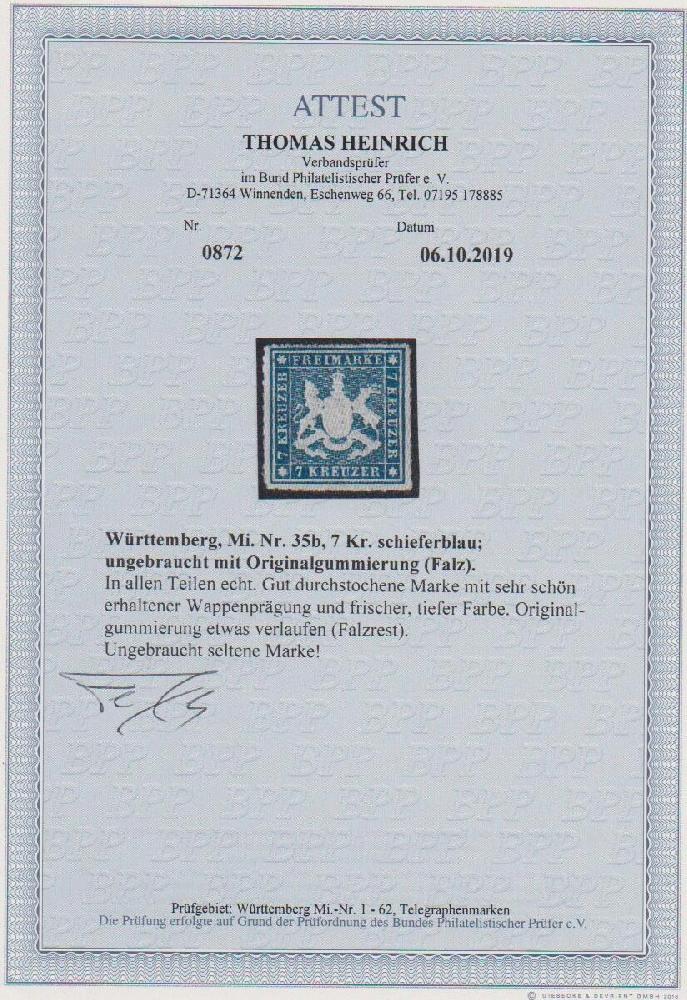 | Zusatzinformationen und Suchstichworte: | Rauhut & Kruschel - 212. Auktion Auktionstermin: 30. Juli 2022 Los 2252 Altdeutschland Württemberg 7 Kr. schieferblau, ungebrauchtes Kabinettstück mit Originalgummierung (im Bereich des Falzrestes etwas verlaufen) und sehr schön erhaltener Wappenprägung sowie frischer, tiefer Farbe. In dieser Erhaltung eine seltene Marke! Attest Heinrich. Mi. 1600,- Ausruf 600,00 EUR |