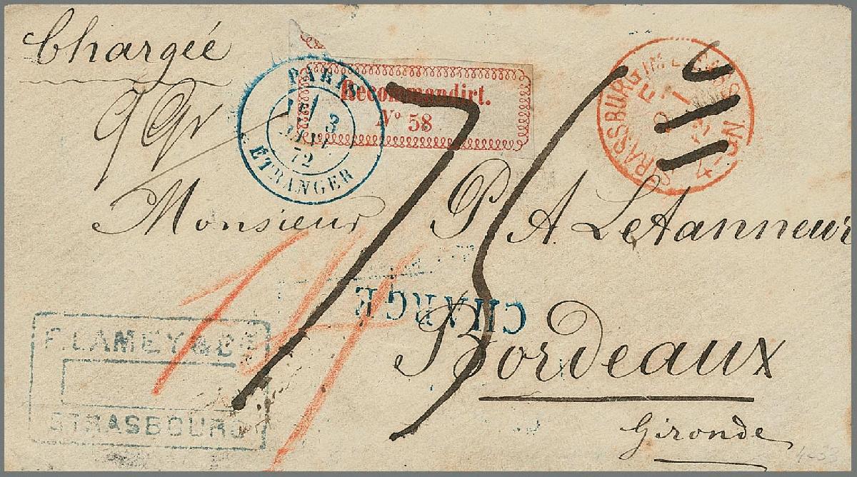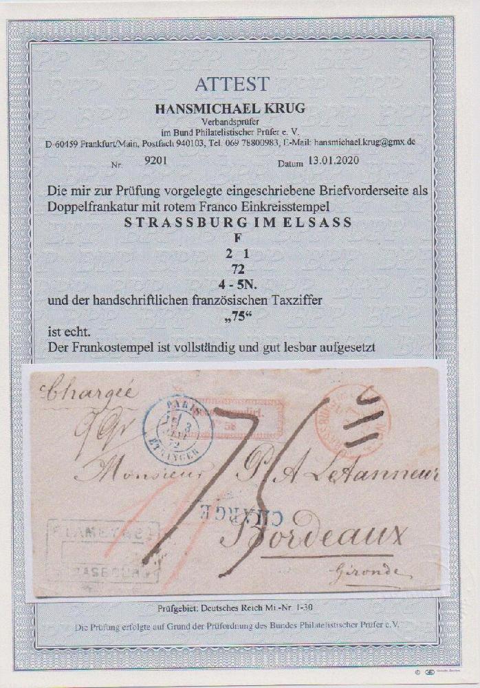 | Zusatzinformationen und Suchstichworte: | Rauhut & Kruschel - 212. Auktion Auktionstermin: 30. Juli 2022 Los 2450 Altdeutschland NDP Elsass-Lothringen "Strassburg im Elsass F.", roter Franko-K1 vom zweiten Tag des Deutschen Reiches, 2.1.72, klar auf Einschreibebriefvs. nach Bordeaux. Doppelfrankatur mit deutschem Portoanteil von 4 Gr. und "75" Cent. für den französischen Anteil, seltener R-Zettel mit Schlingenmuster, Attest Krug Ausruf 250,00 EUR |
