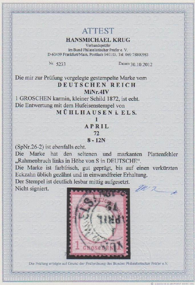 | Zusatzinformationen und Suchstichworte: | Rauhut & Kruschel - 212. Auktion Auktionstermin: 30. Juli 2022 Los 2482 Deutsches Reich 1 Gr. rosa, Prachtstück (ein min. verkürzter Zahn) mit gut sichtbarem Plattenfehler "Rahmenbruch links oben", Attest Krug. Mi. 350,- Ausruf 60,00 EUR |
