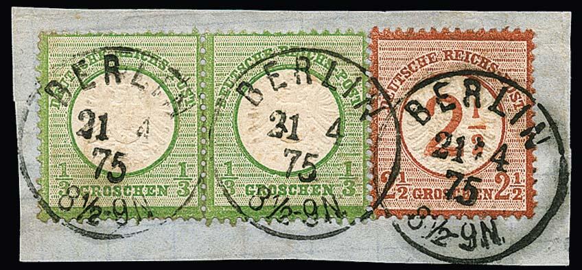 | Zusatzinformationen und Suchstichworte: | Rauhut & Kruschel - 212. Auktion Auktionstermin: 30. Juli 2022 Los 2512 Deutsches Reich 1/3 Gr. grün im waagerechten Paar, deutlich nach Ablauf der Gültigkeit verwandt am 21.4.1875, nebst 2 1/2 a. 2 1/2 Gr. rotbraun, auf Briefstück mit K1 von Berlin. Linke 1/3 Gr. übliche Zähnung, tadelloses Attest Sommer Ausruf 350,00 EUR |