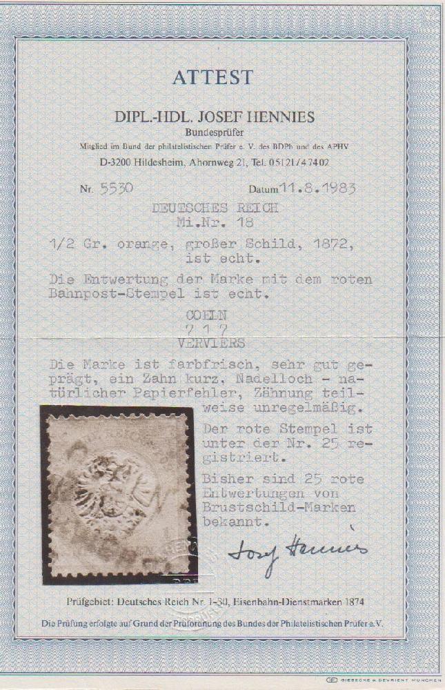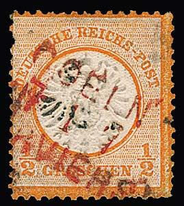 | Zusatzinformationen und Suchstichworte: | Rauhut & Kruschel - 212. Auktion Auktionstermin: 30. Juli 2022 Los 2517 Deutsches Reich 1/2 Gr. orange (kleine Fehler) mit sehr seltener Entwertung durch roten Bahnpost-L3 "Coeln-Verviers", Attest Hennies Ausruf 180,00 EUR |