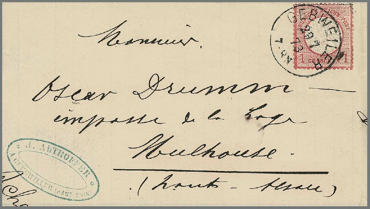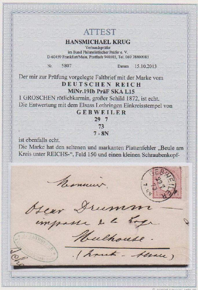 | Zusatzinformationen und Suchstichworte: | Rauhut & Kruschel - 212. Auktion Auktionstermin: 30. Juli 2022 Los 2544 Deutsches Reich 1 Gr. rosa mit Plattenfehler "Beule am Innenkreis", sowie SKA, auf Prachtbrief mit klarem K1 von Gebweiler, ein min. verkürzter Zahn (belanglos), Attest Brugger. Mi. 1000,- Ausruf 220,00 EUR |